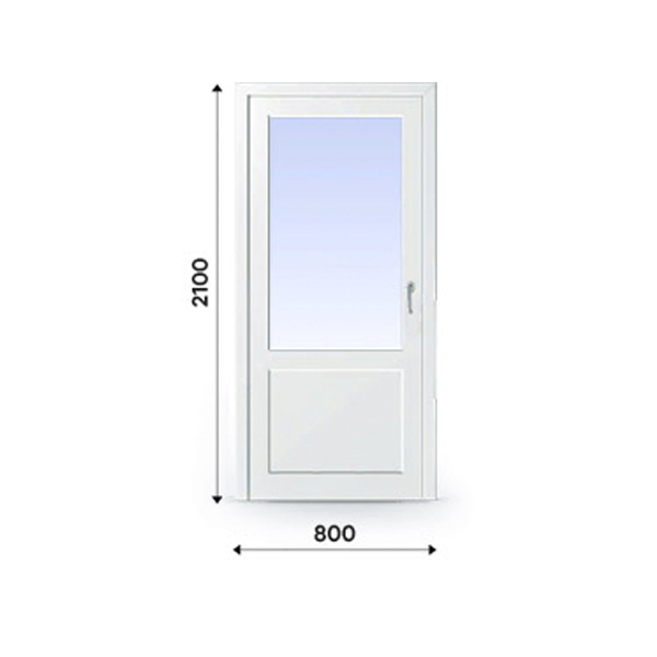 Пластиковая дверь со стеклянной вставкой сверху Rehau изготавливается из профиля REHAU Blitz и имеет размеры 800х2100 мм.